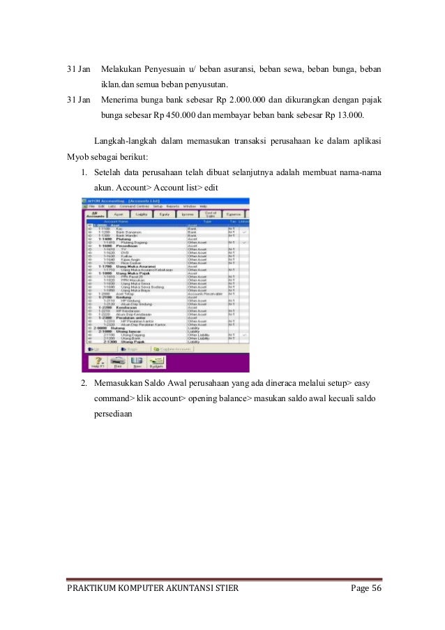 Untuk memulai myob, lakukan doubleclick pada icon myob accounting v19. Dalam myob, terdapat jendela dalam new company file assistant yang bertanya tentang periode akuntansi yang akan dibuat yaitu menu … a. Transaksi tersebut dicatat dalam myob accounting menggunakan menu purchase. Myob accounting adalah sebuah software akuntansi yang diperuntukkan bagi usaha kecil menengah ( ukm ) yang dibuat secara terpadu (integrated software ). Mind your own business (myob) merupakan salah satu aplikasi komputer akuntansi yang digunakan dalam mengolah data akuntansi.